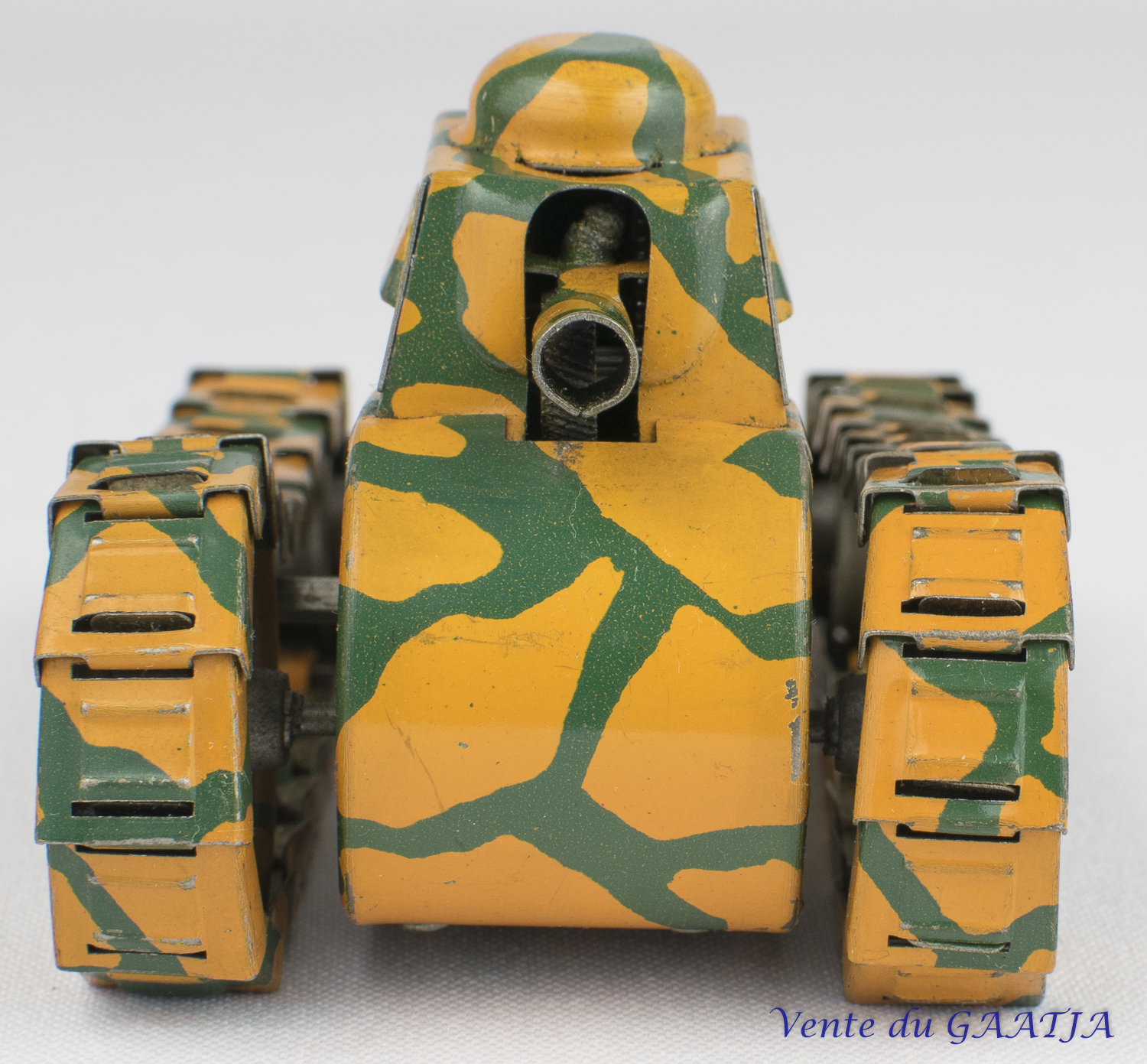 mécanique, motif camouflage Manque les deux chenilles & petit enfoncement au niveau du canon. Pas de clé. Fonctionne. 15 cm 50 Eur. + frais d'expédition (Tarif B) Réf. "JM32" |