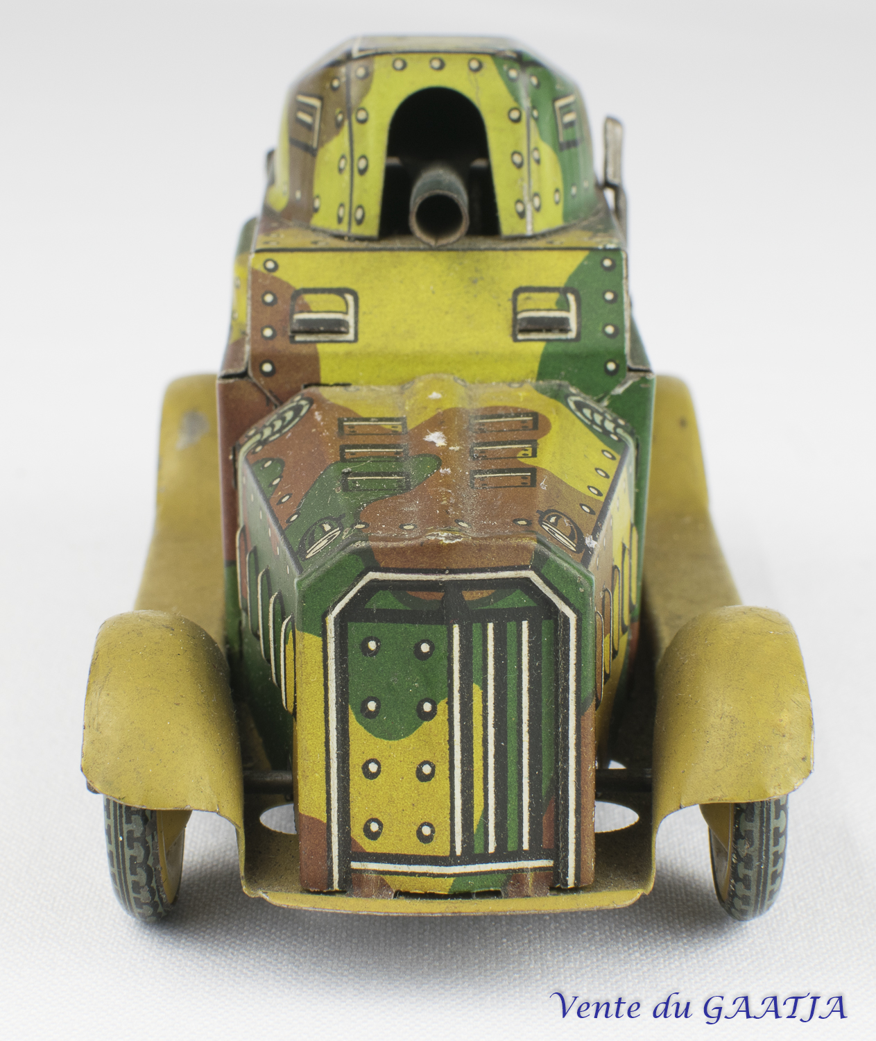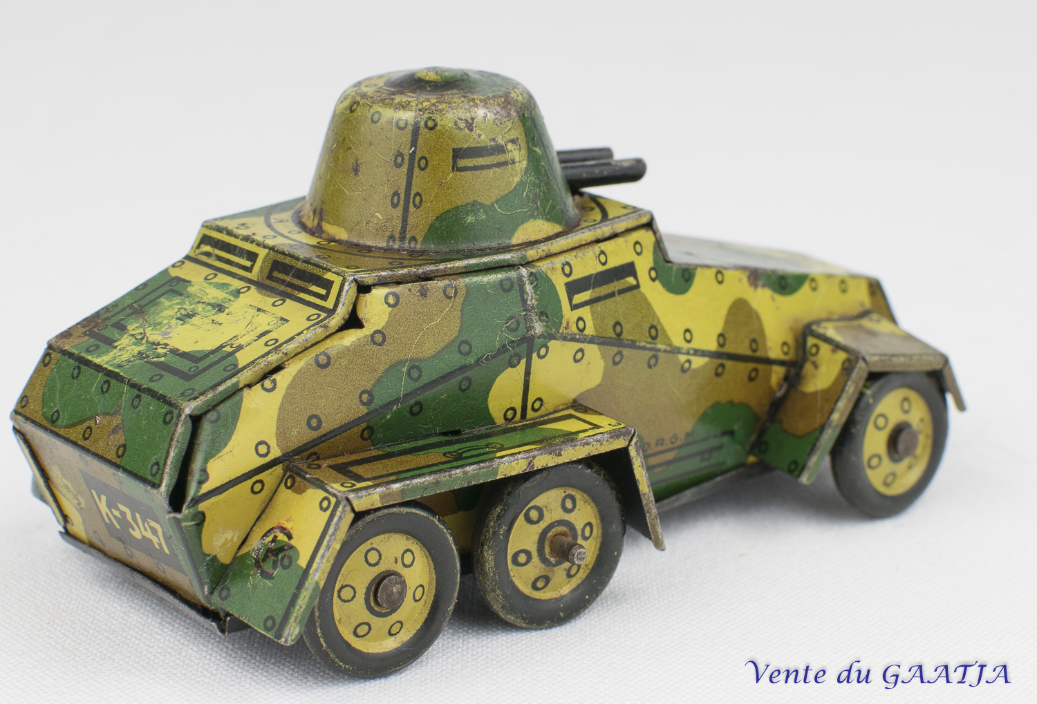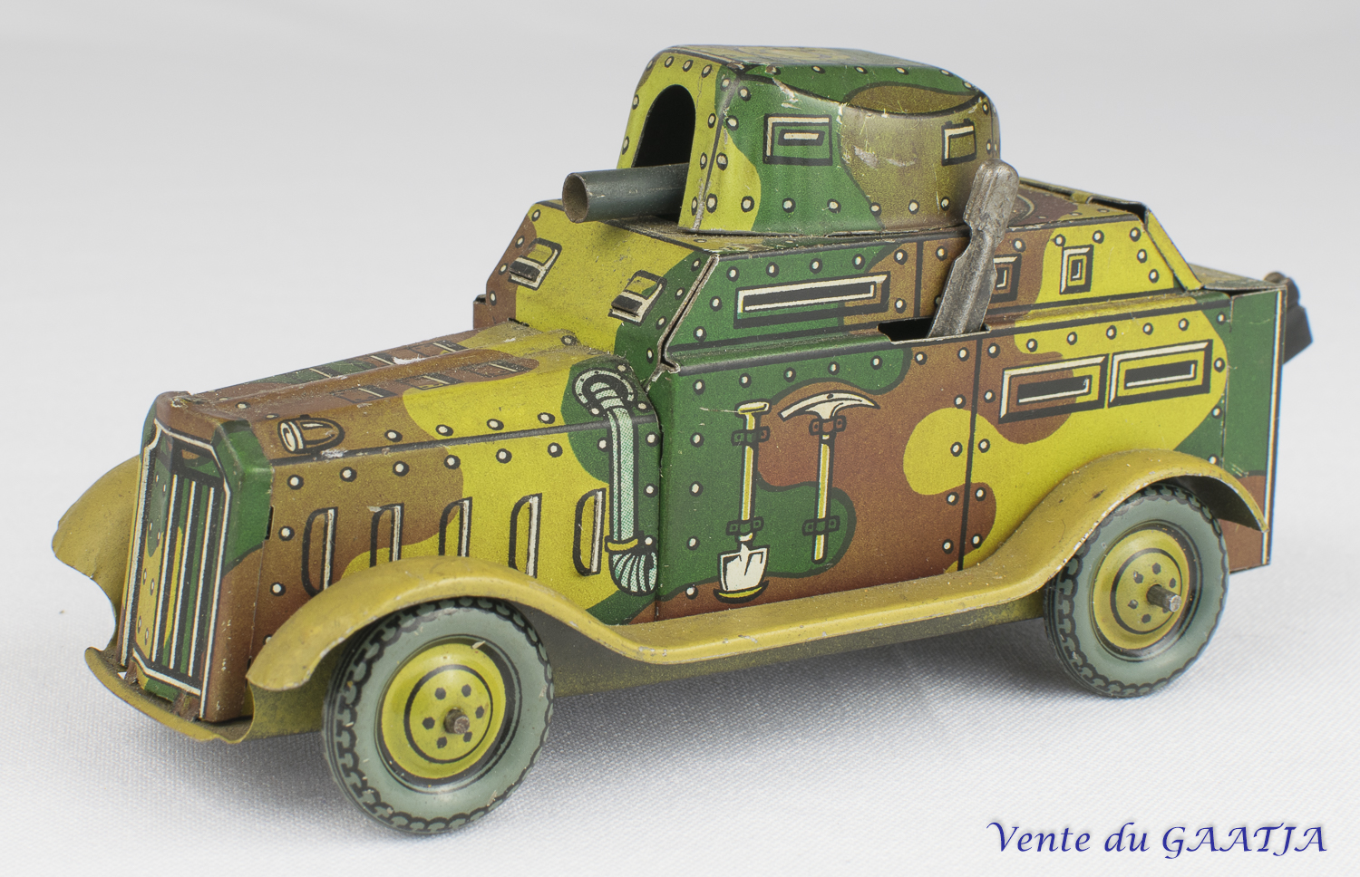 Auto-mitrailleuse "camouflage" mécanique en tôle. 10 cm, fonctionne. Pas de clé. Aile arrière gauche abîmée avec manque 50 Eur. + frais d'expédition (Tarif A) Réf. "JM50" Réservé |