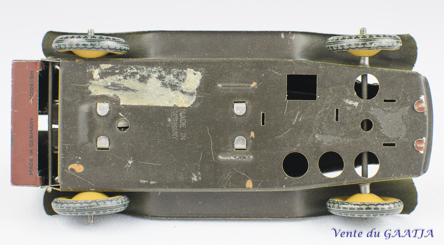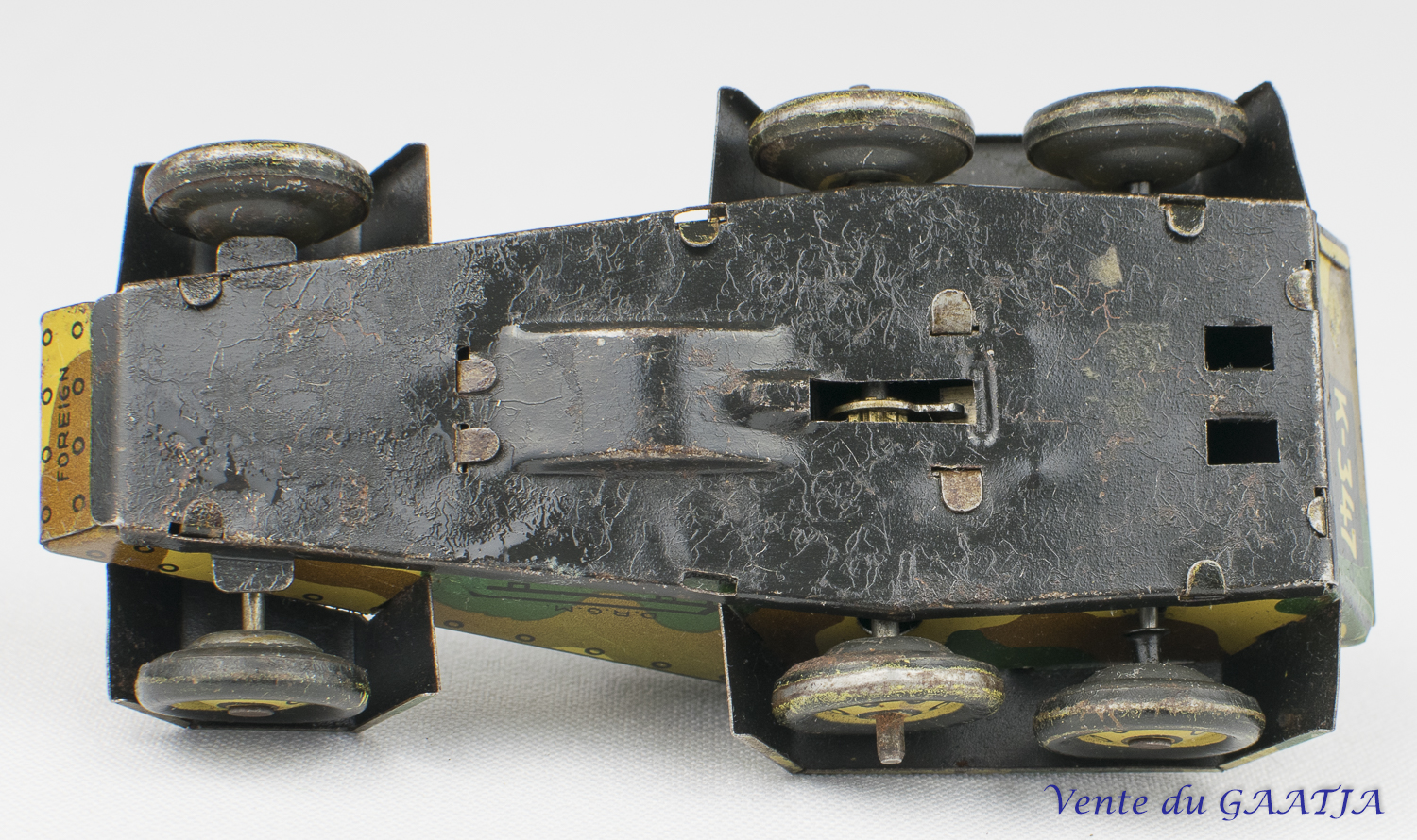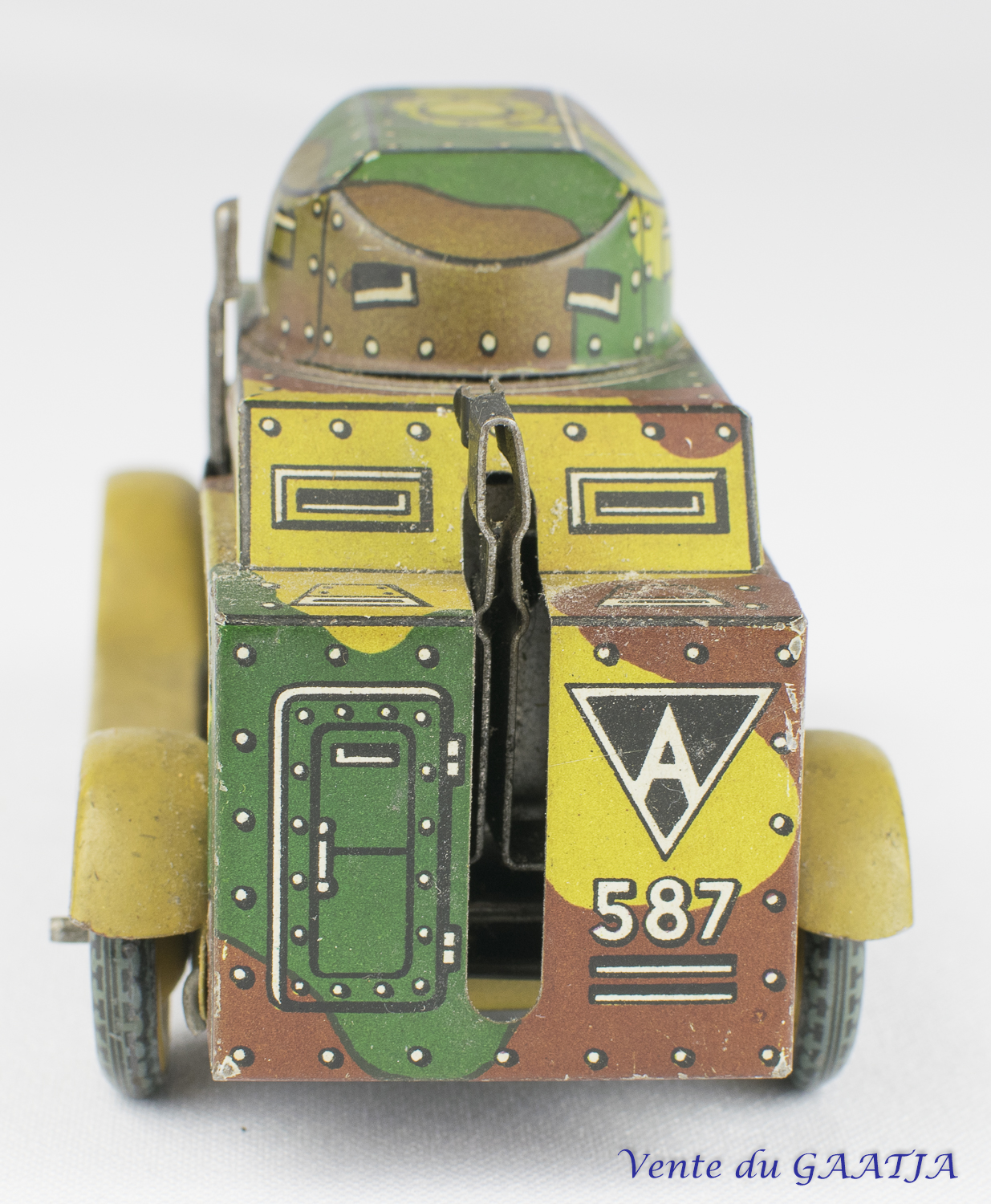 Auto-mitrailleuse "camouflage" mécanique en tôle. 10 cm, fonctionne. Pas de clé. Aile arrière gauche abîmée avec manque 50 Eur. + frais d'expédition (Tarif A) Réf. "JM50" Réservé |
